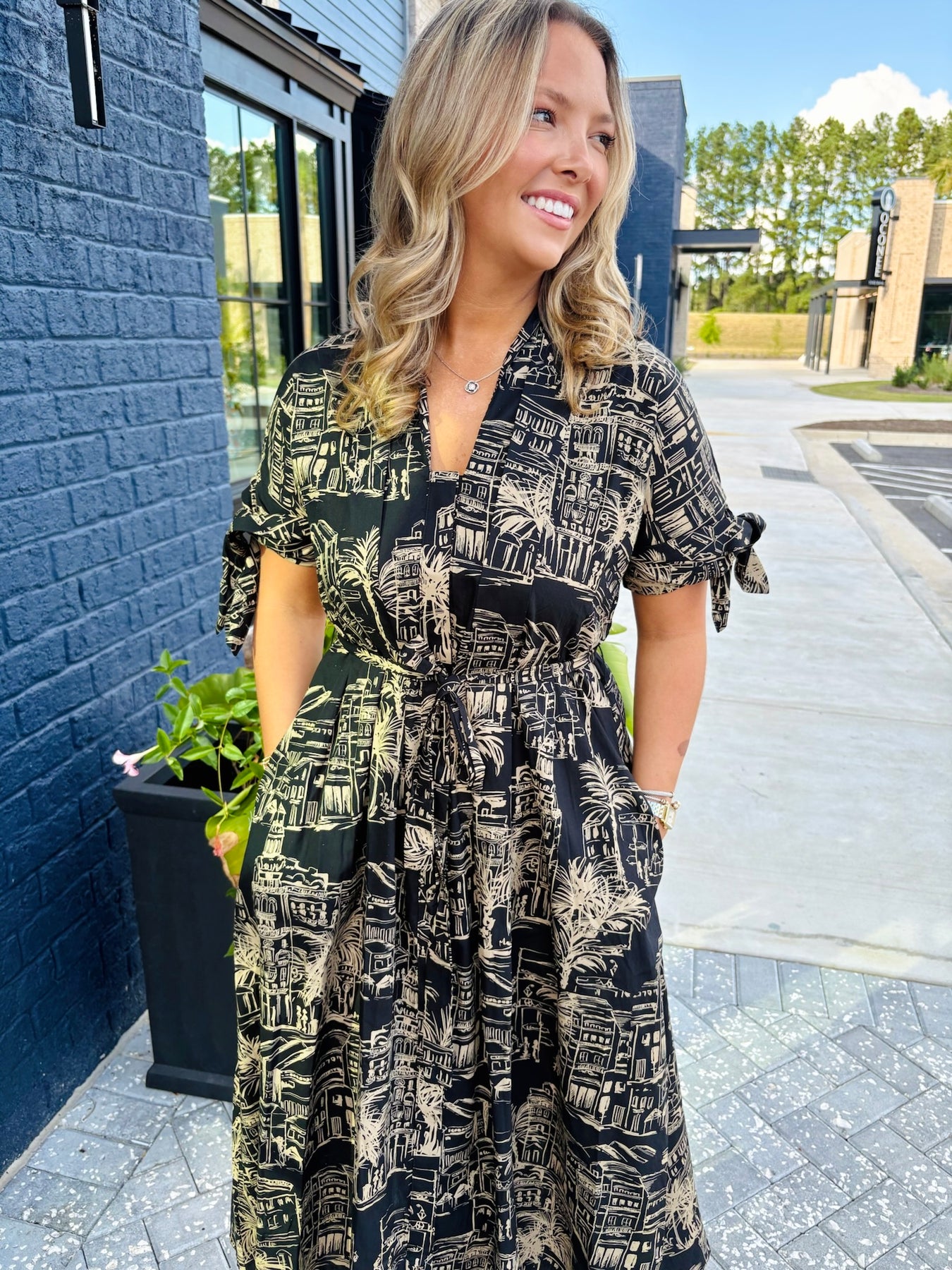 Black maxi dress with neutral sketch pattern. Utility full button down body with tie waistband. Has pockets!
