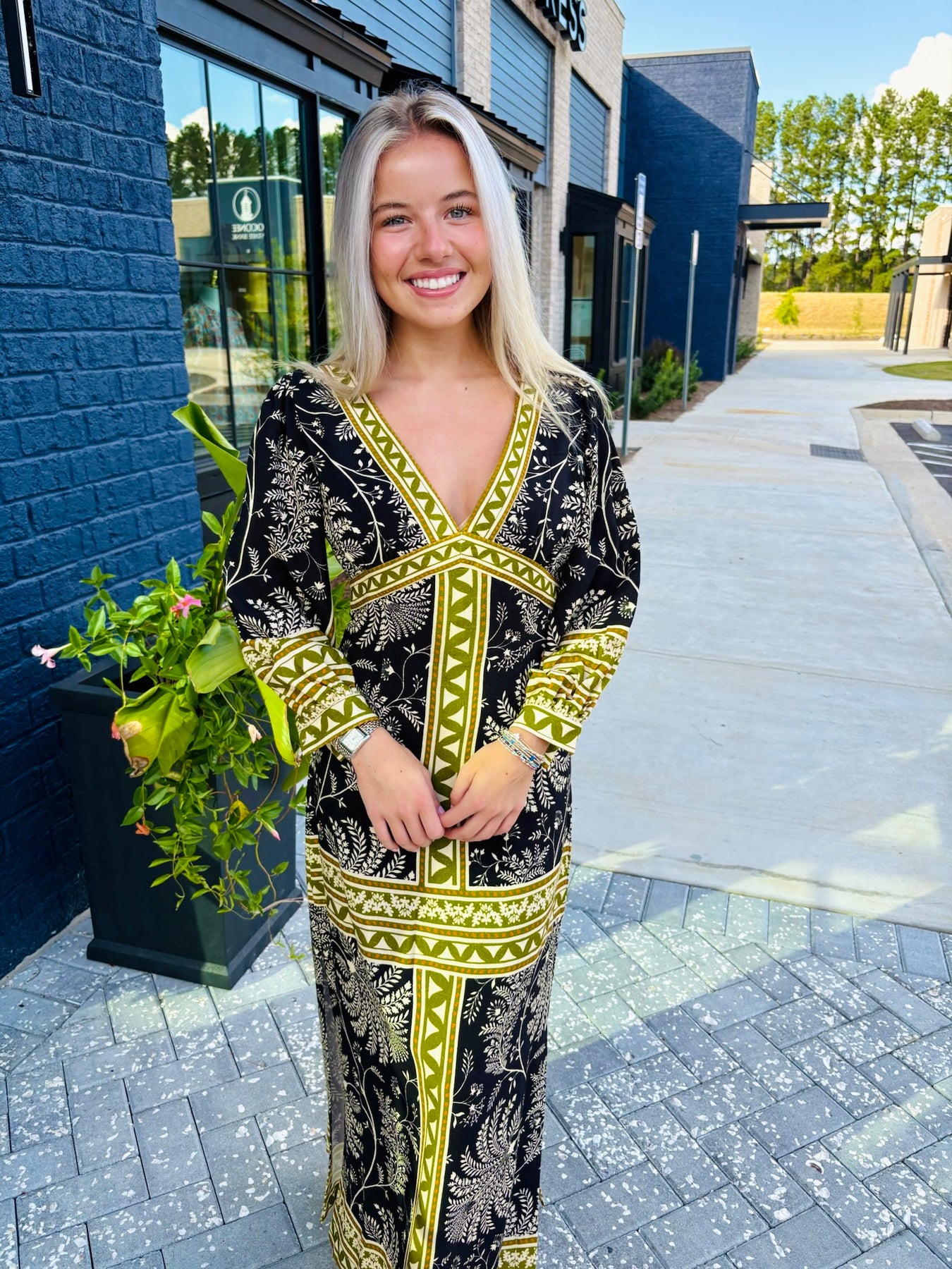 Three-quarter length sleeve patterned midi dress with a v-neckline! Can easily be dressed up or down and is a great transitional piece between summer and fall! Double lined with a split hem.