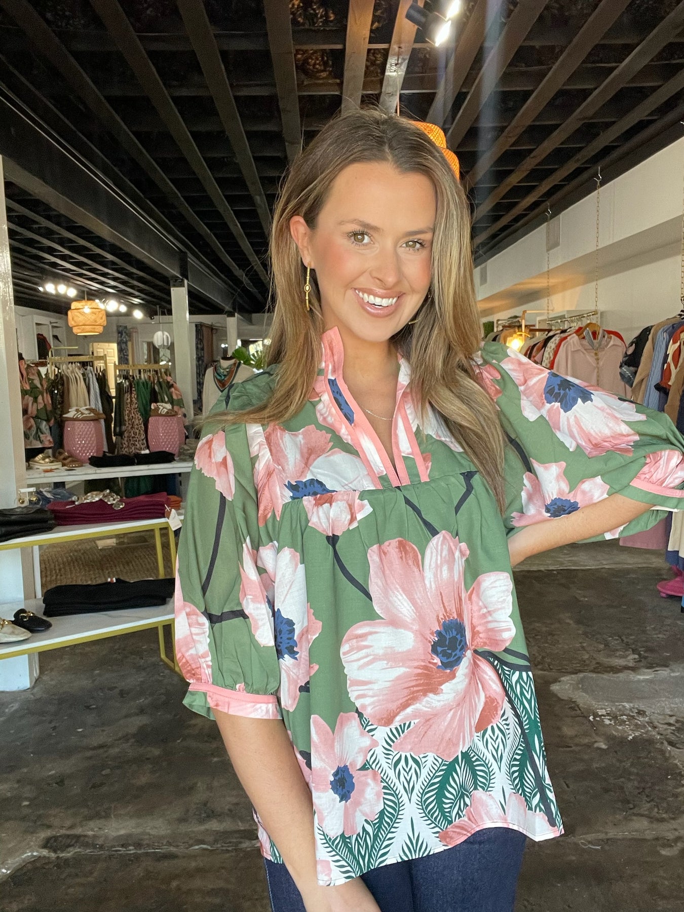 Olive Bloom Collared Puff Sleeve Top
