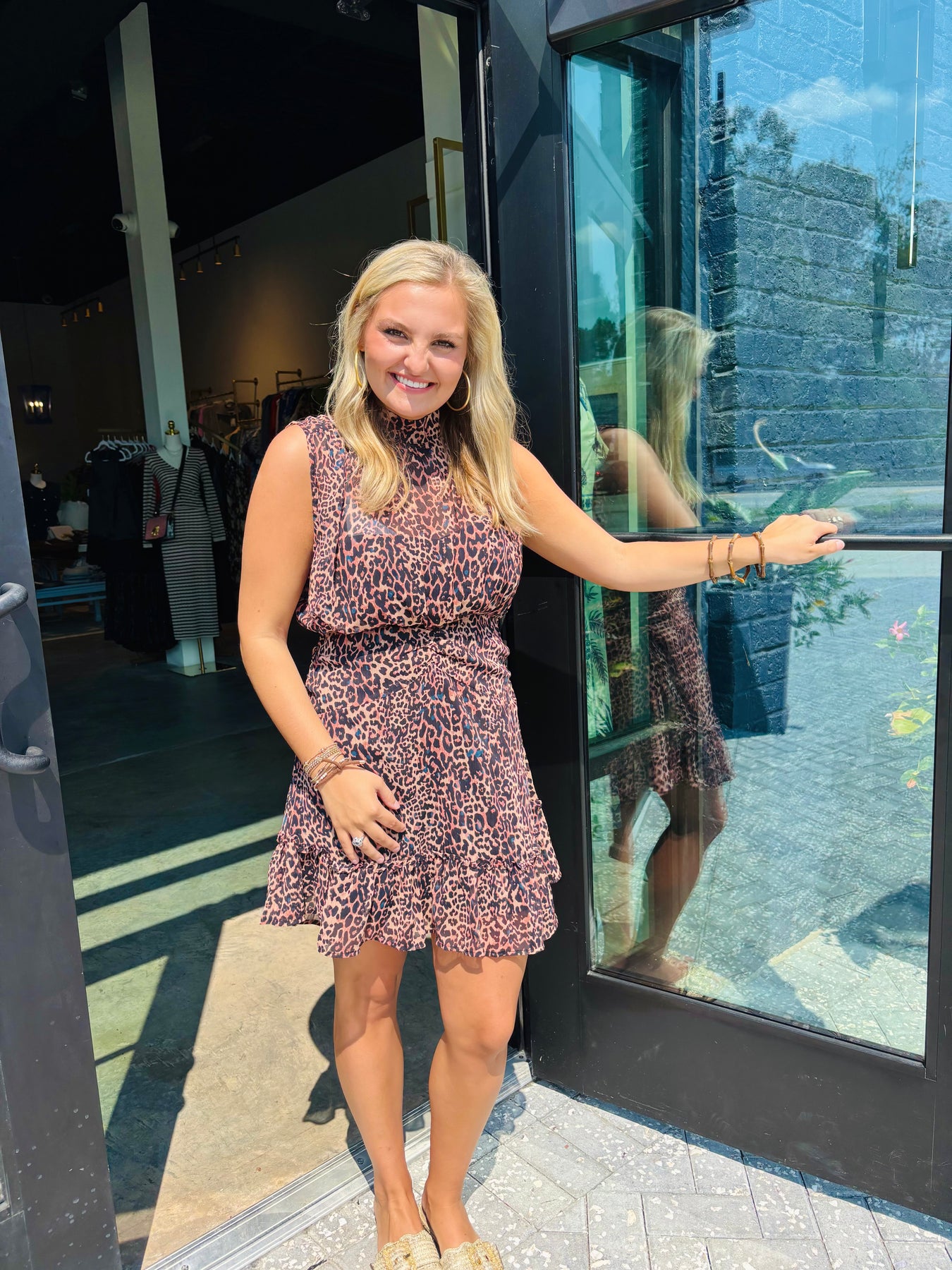A lightweight mockneck dress with a ruffled hem and ruching at the waist. The semi-sheer leopard print overlay is complemented by a black slip underneath. Would look great paired with boots or heels. Back zipper closure.