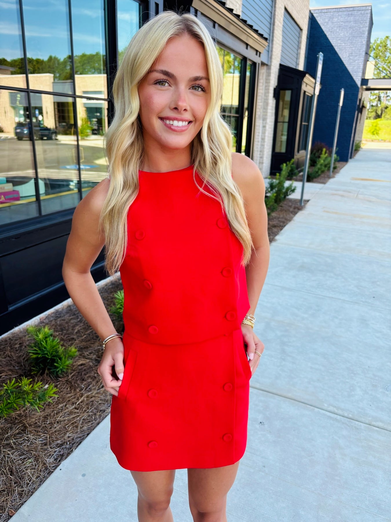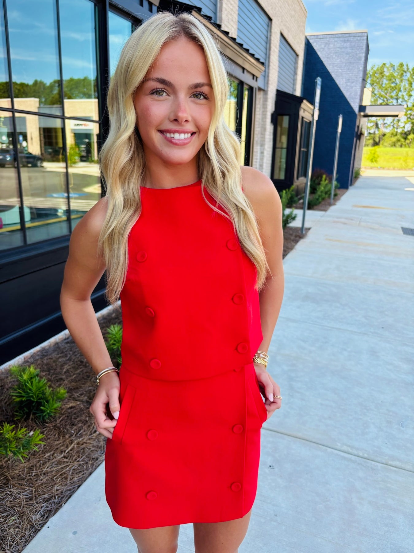 French Connection red sleeveless top with buttons in the front.