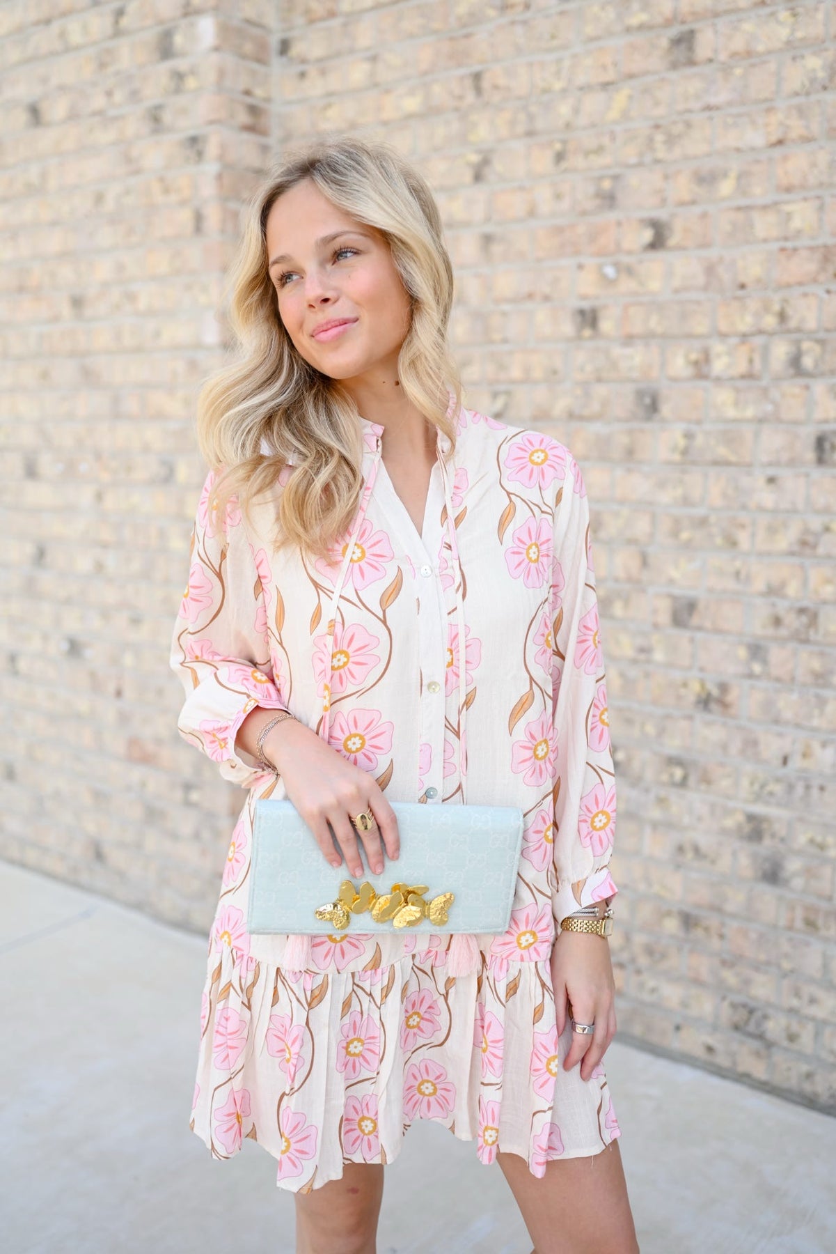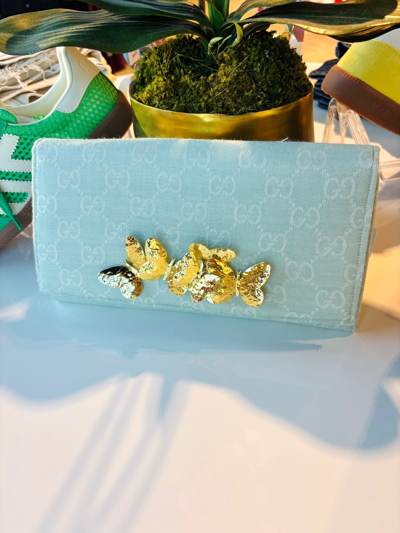 This clutch is made from a Gucci scarf featuring the iconic interlocking "GG" monogram in light blue. We have topped the crossbody clutch with our gold butterflies.  The clutch interior is lined with dusty blue linen, and contains accordion sides with grommets for a removable  chain (chain is included). Overall clutch dimensions are 10" x 5" with a magnetic snap closure.
