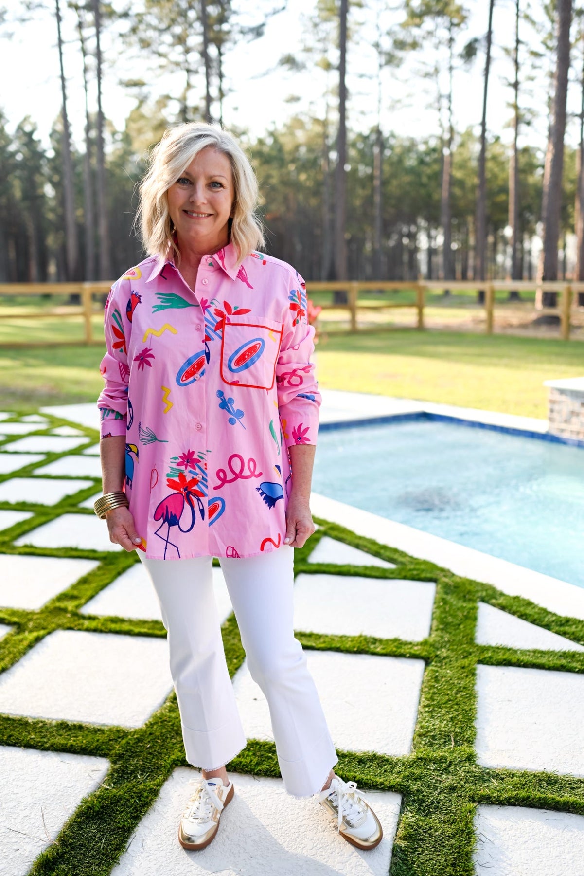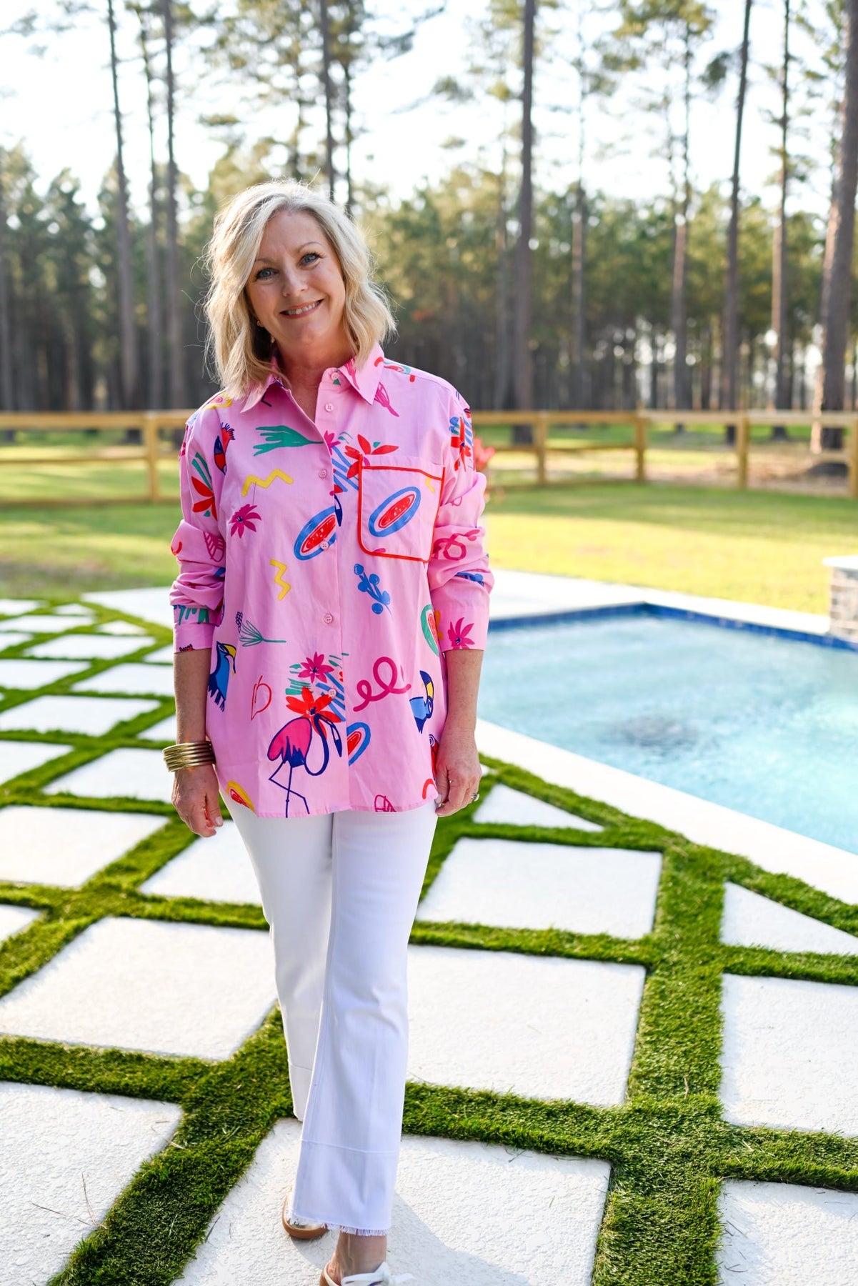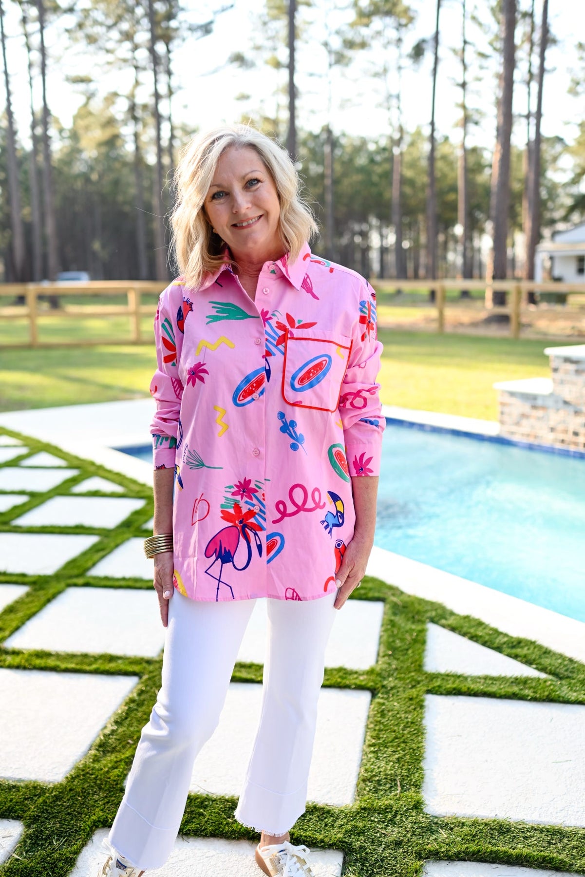 Pink patterned button-down top with statement pocket.
