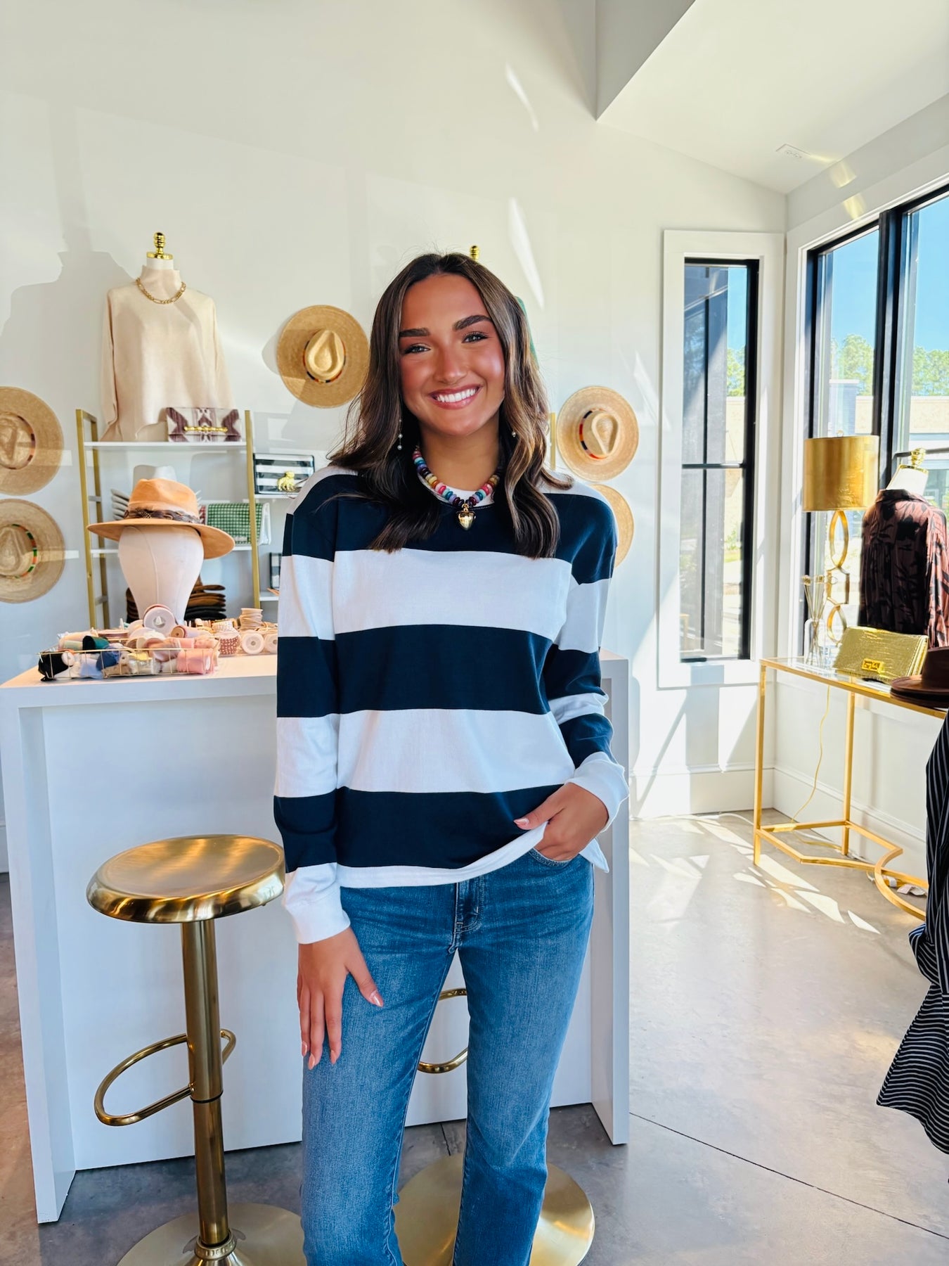 Cute & casual in our colorblocked striped t-shirt! Comes in green or navy!