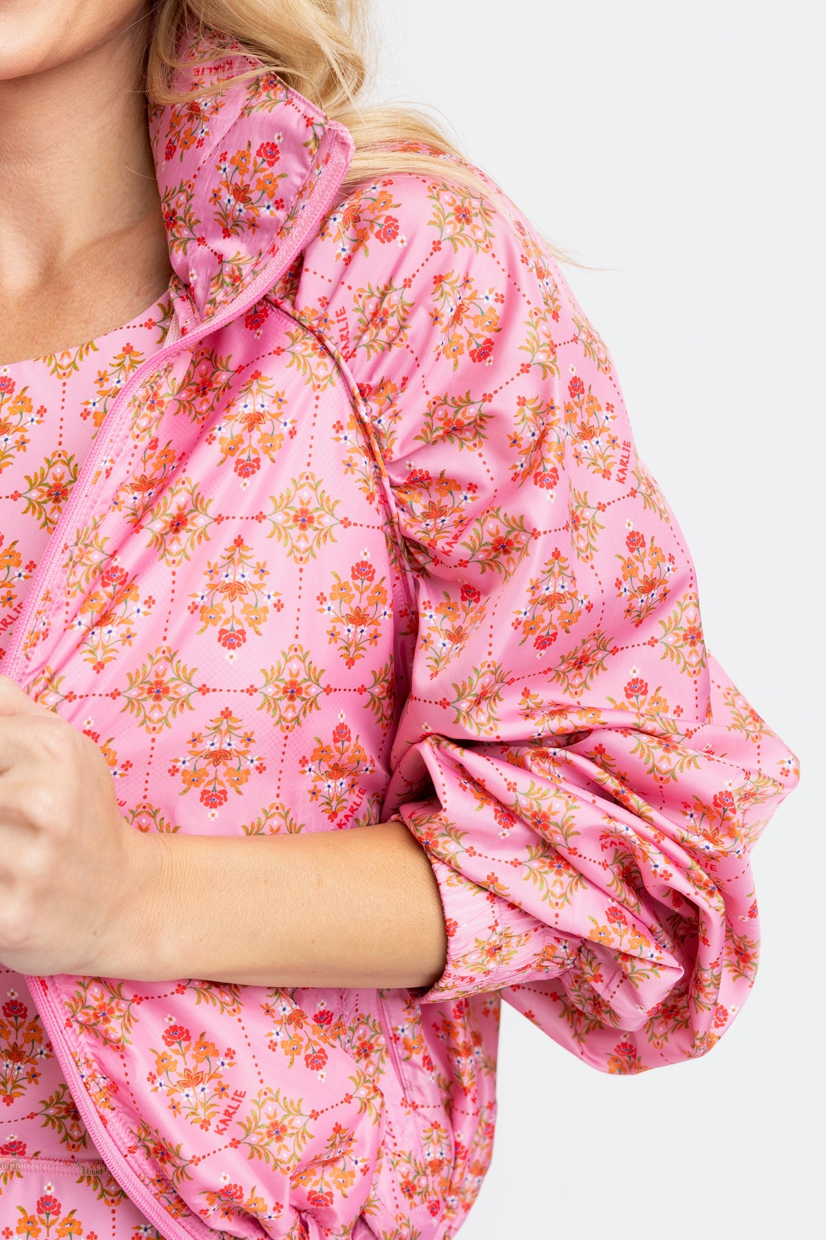 Pink floral wind breaker jacket with tuckable hood! Featuring pockets, a full zipper and a cinchable waistline.