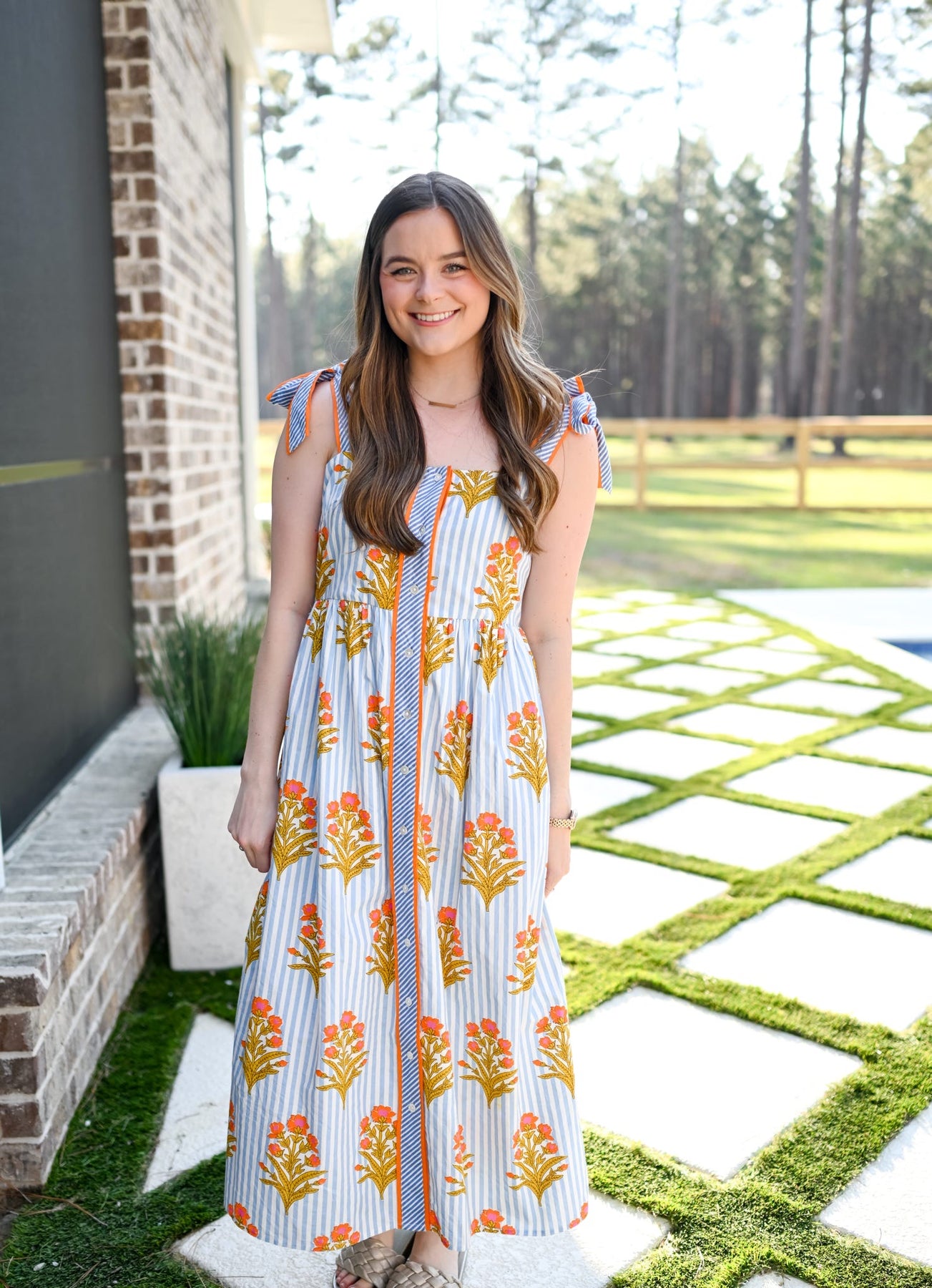 A fun floral patterned midi dress with tie straps, buttons down the front, and pockets! Pair with sandals, wedges, or sneakers!