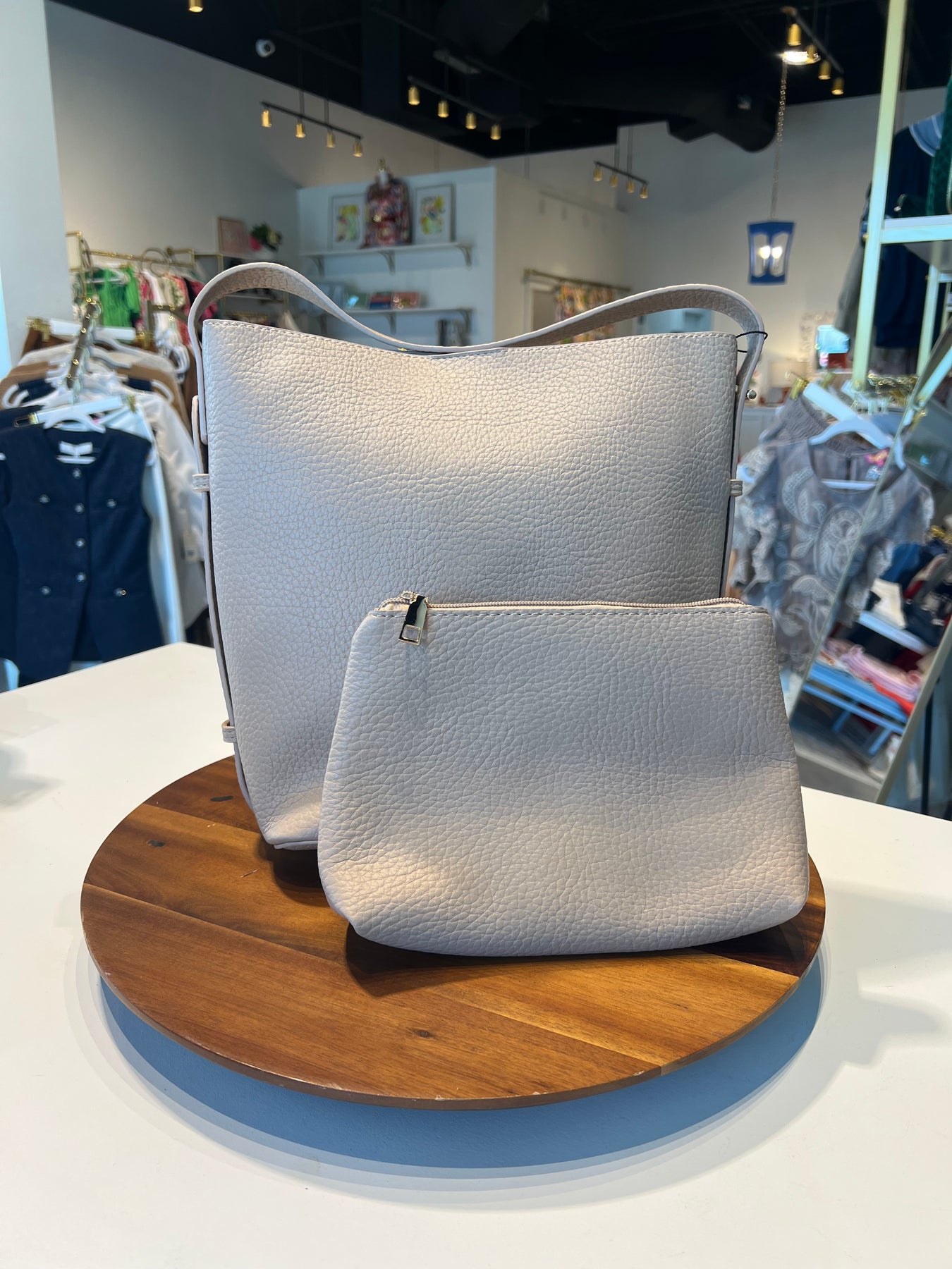 Beige paloma bag with matching pouch and optional crossbody strap.