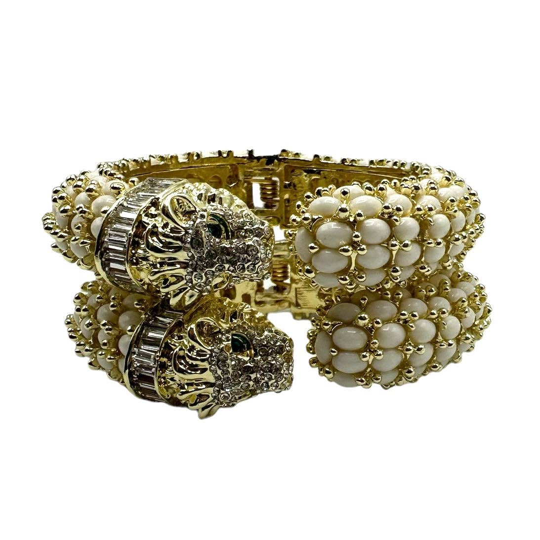 * White beads and a brilliant pave rhinestone head make the perfect vintage statement. * Hinged closure provides ease of use. * These have a substantial weight indicating high quality and a satisfying presence on the wrist. This is a fabulous hinged bracelet inspired by our ever-popular smooching leopards hardware. The bracelet is adorned with white beads embedded into a gold setting, and features a sparkly rhinestone pave leopard's head. It provides a delightful vintage style that holds its own on any wrist.