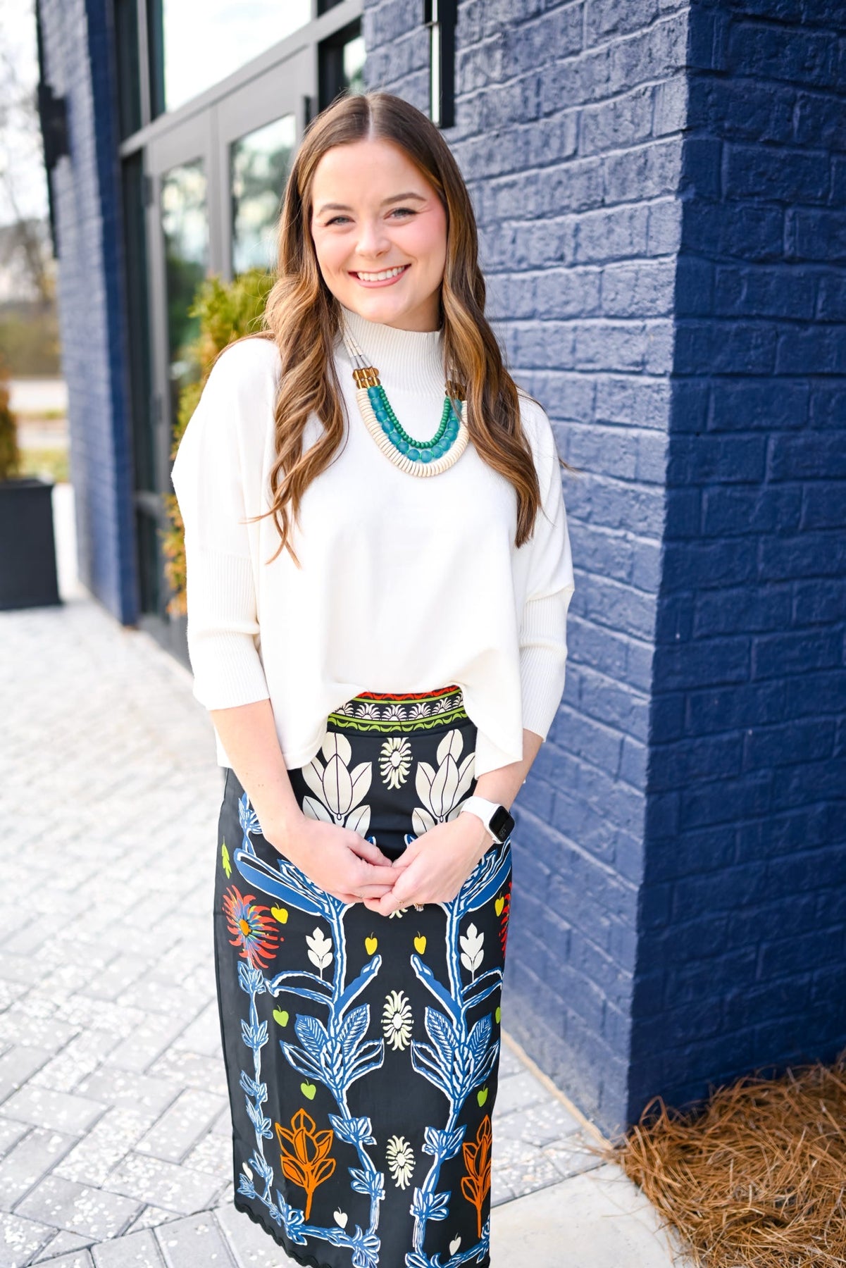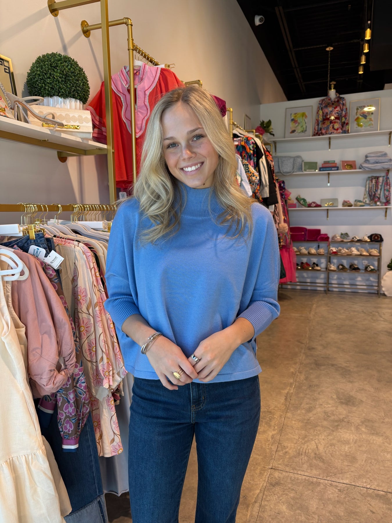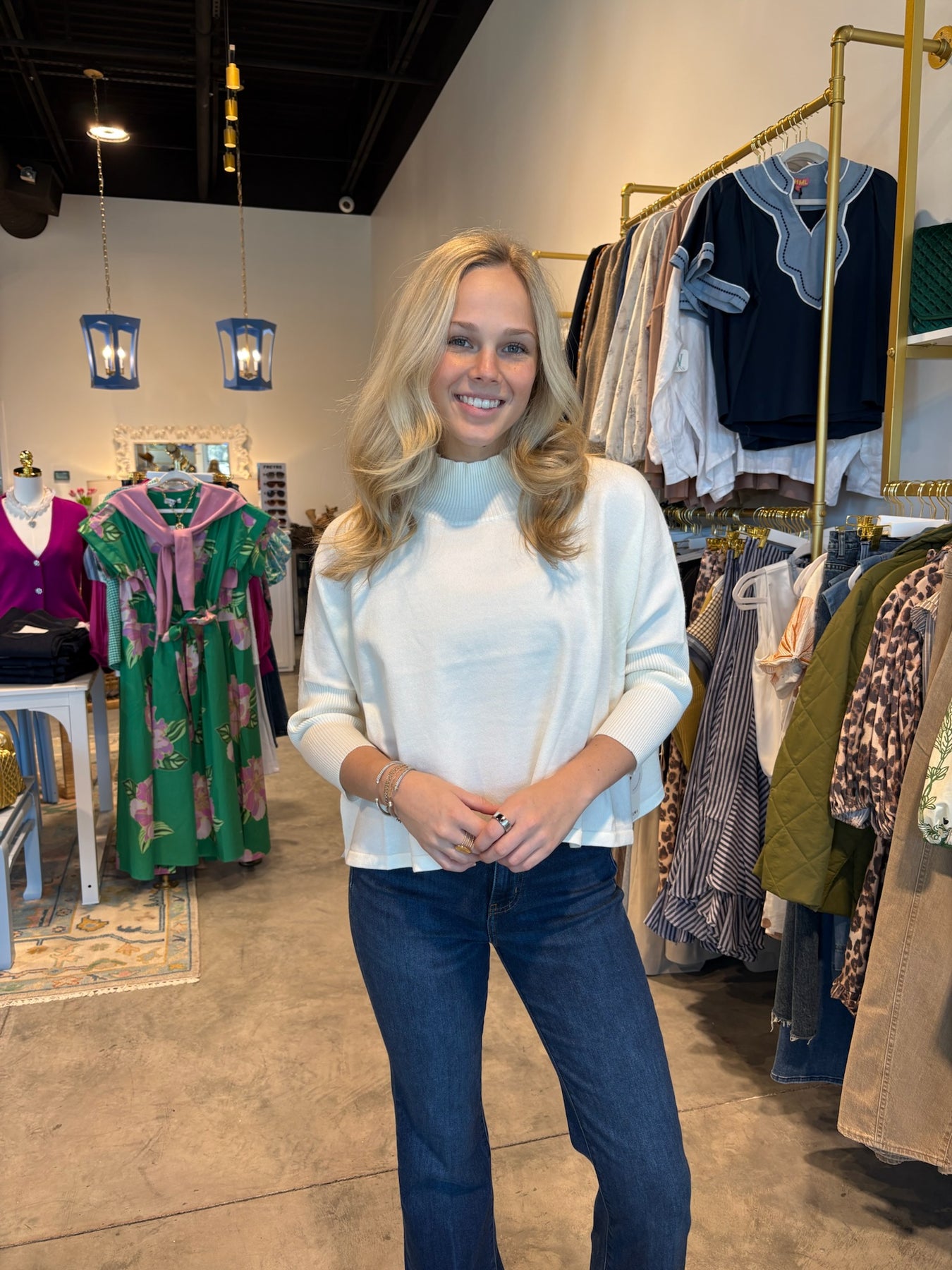 Boxy mock neck 3/4 sleeve top in solid color with rib hem accents. So cute paired with a maxi/midi skirt or jeans!