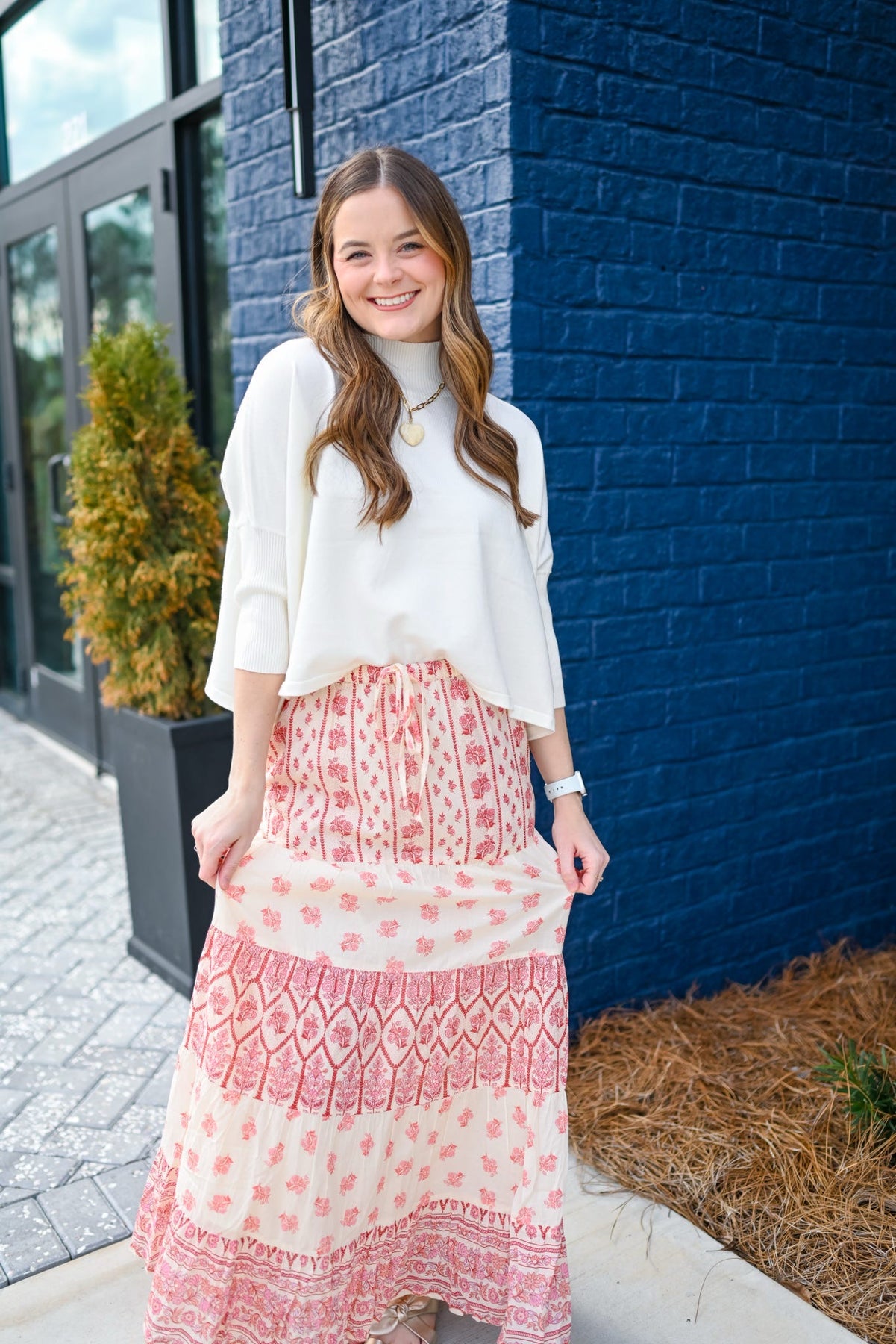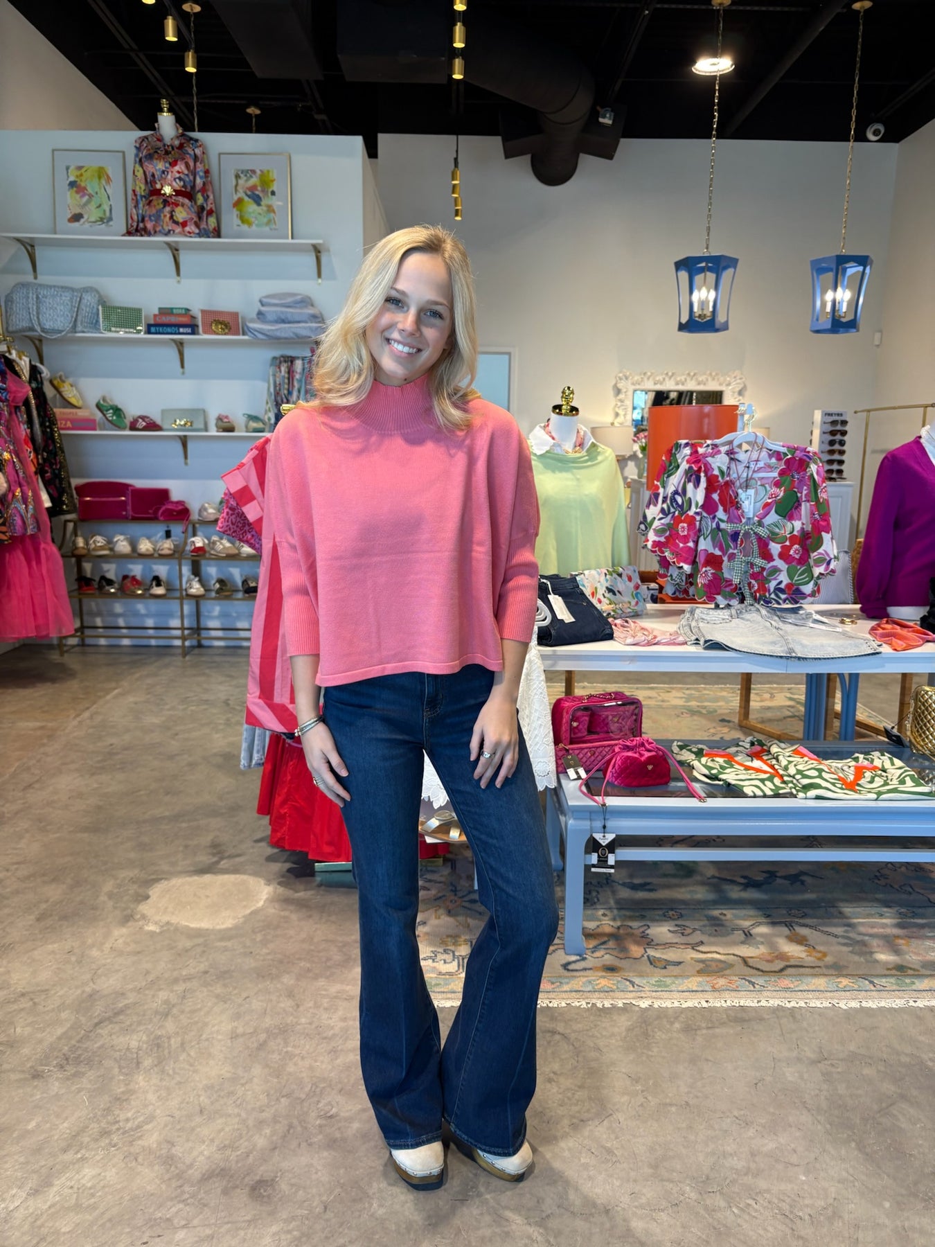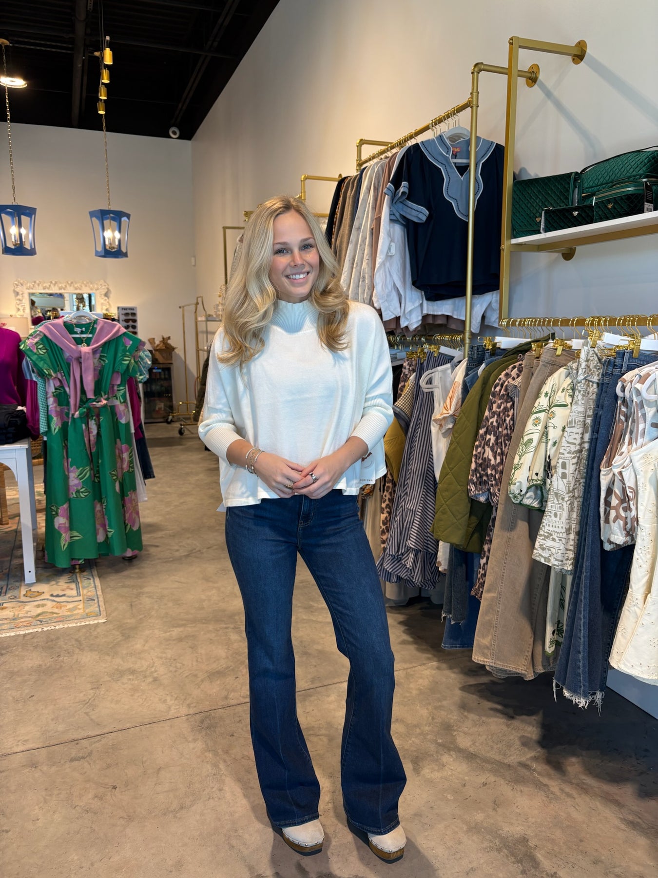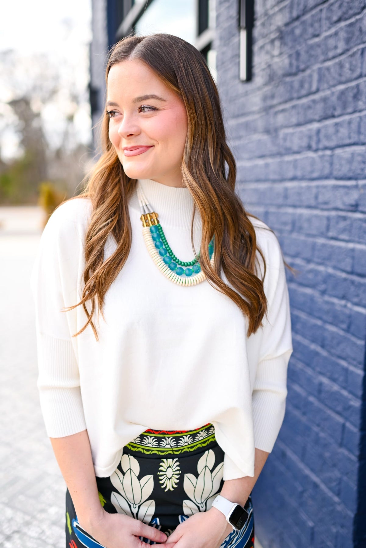 Boxy mock neck 3/4 sleeve top in solid color with rib hem accents. So cute paired with a maxi/midi skirt or jeans!