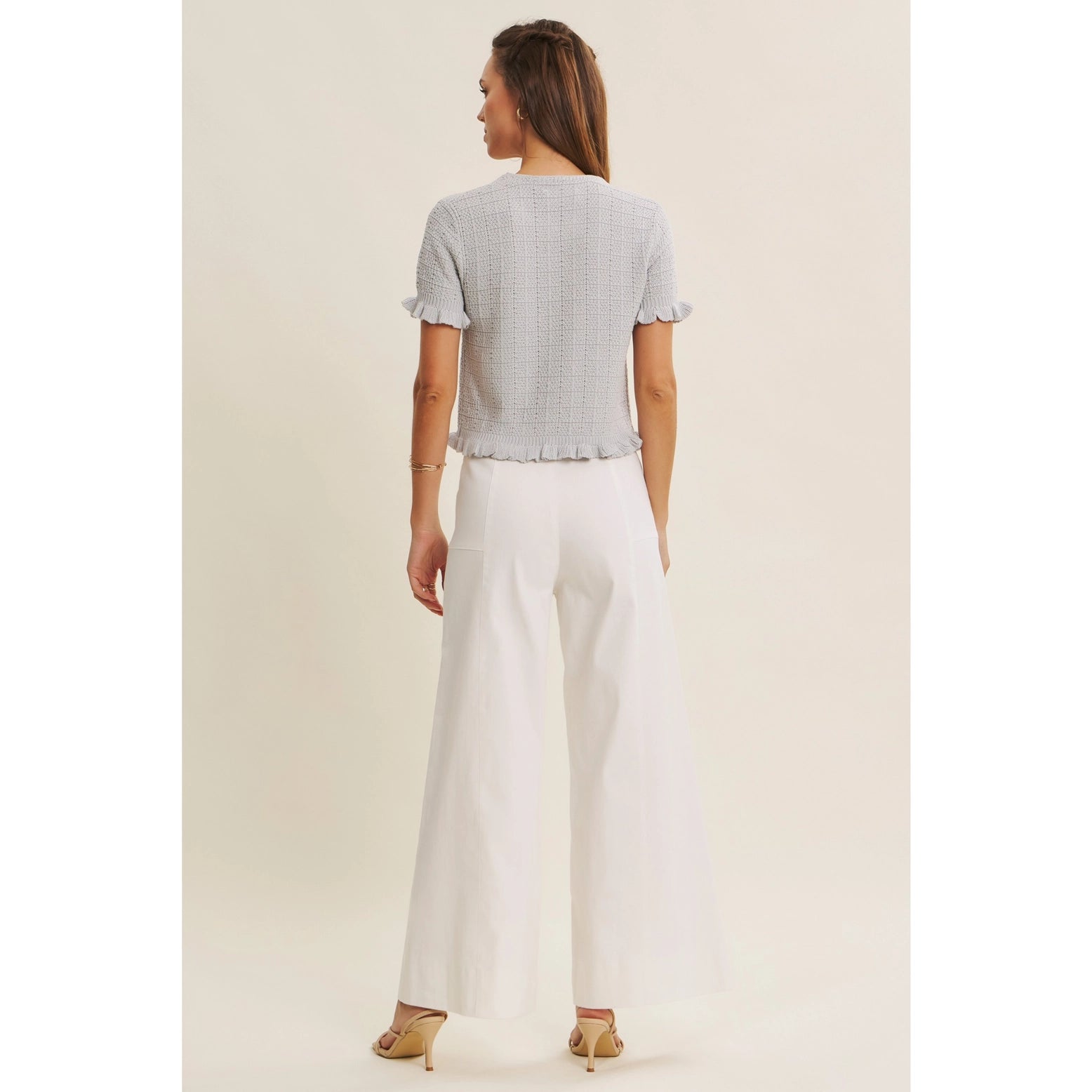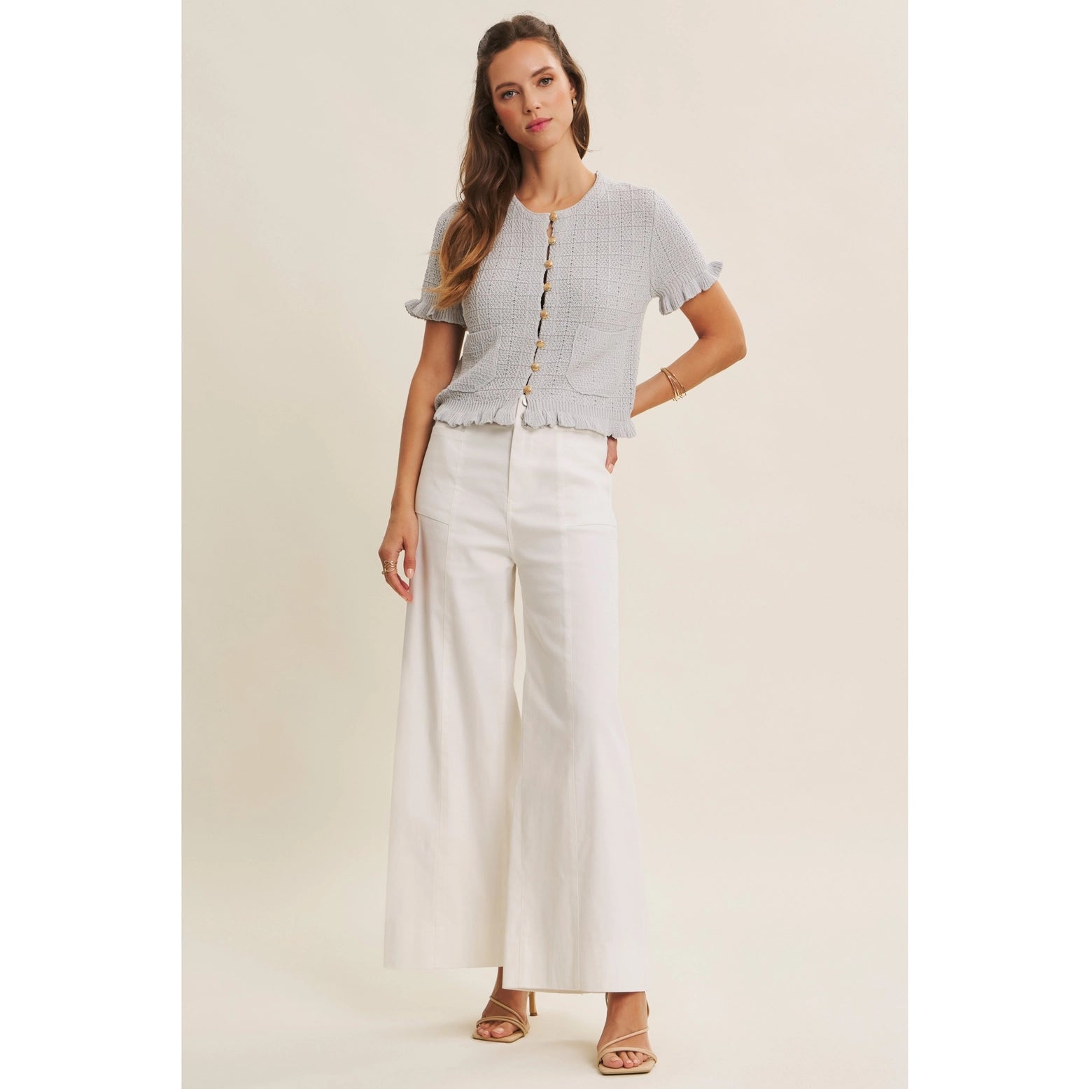 Timeless elegance meets everyday ease. This textured knit cardigan top captures that classic, polished charm with a touch of romance. Featuring gold buttons and softly ruffled hems, it brings subtle sophistication to your look without feeling too formal. The short sleeves and airy knit make it perfect for transitional weather, while the structured texture adds an elevated feel. Wear it buttoned up as a refined top or layer it open over a camisole for a relaxed, chic vibe. From brunch dates to office styling, this piece transitions beautifully through every moment of your day. A seasonless staple that feels both feminine and effortlessly put-together.