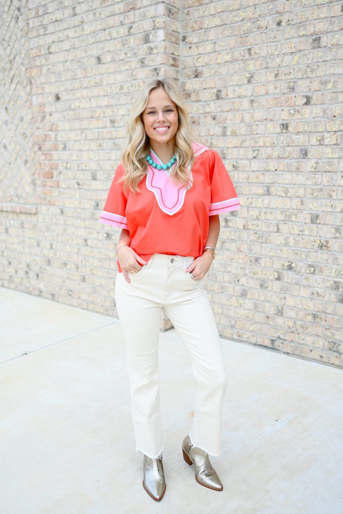 Short sleeve coral top with wide sleeves and embroidered contrast trim! So cute for a casual date night or a simple day running errands!