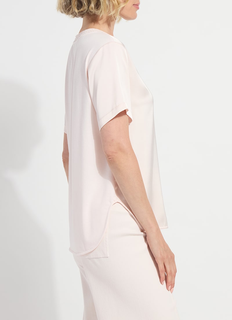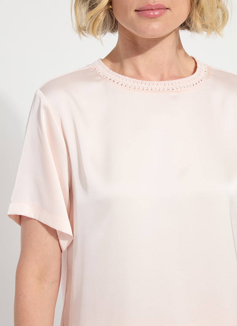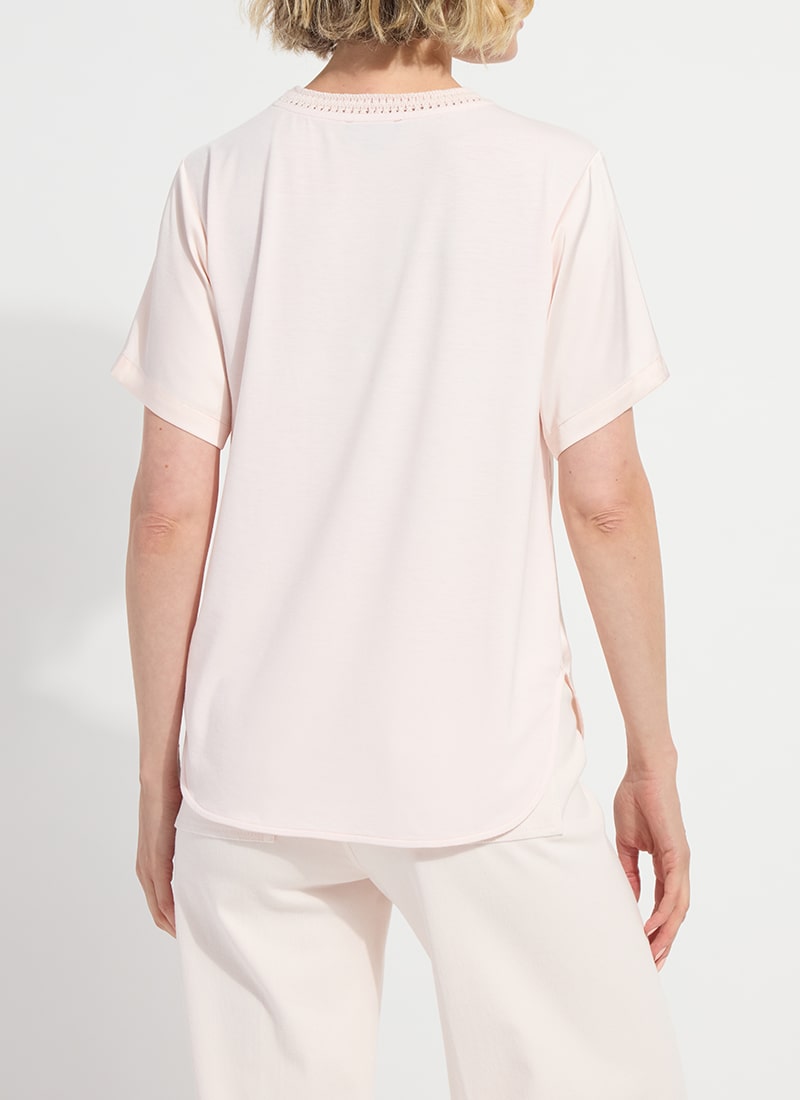 Short sleeve classic top with crochet detailing at the neckline and a split hem.