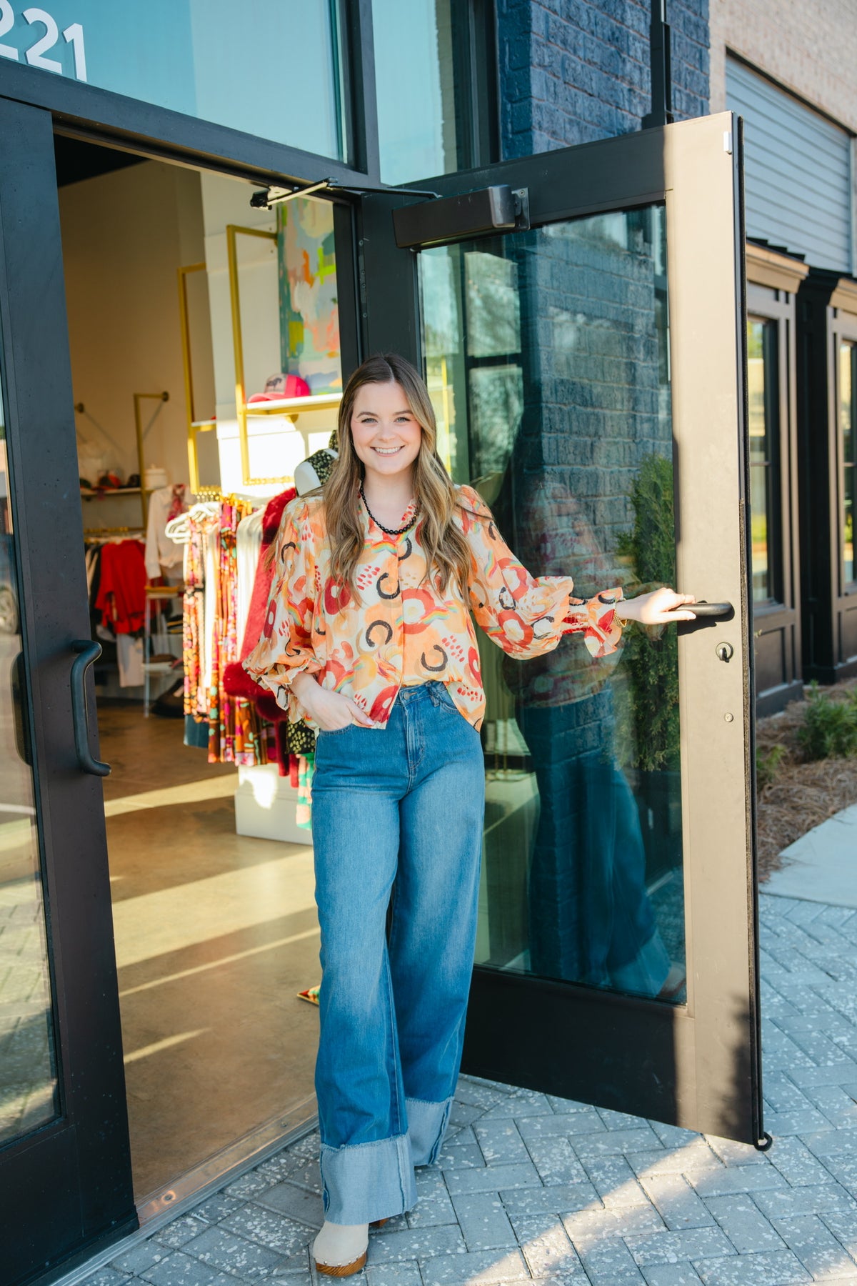 Jade abstract fully lined button down blouse.
