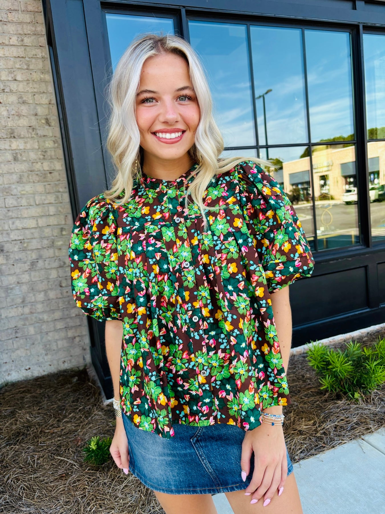 Short sleeve floral printed top with buttons down the front and pleats to add some extra flair! Perfect to pair with jeans and a cute pair of sneakers.