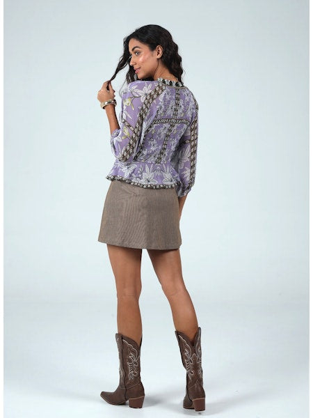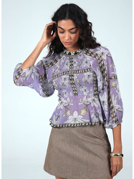 Three-quarter length sleeve top with a ruched bodice and ruffle hemline.