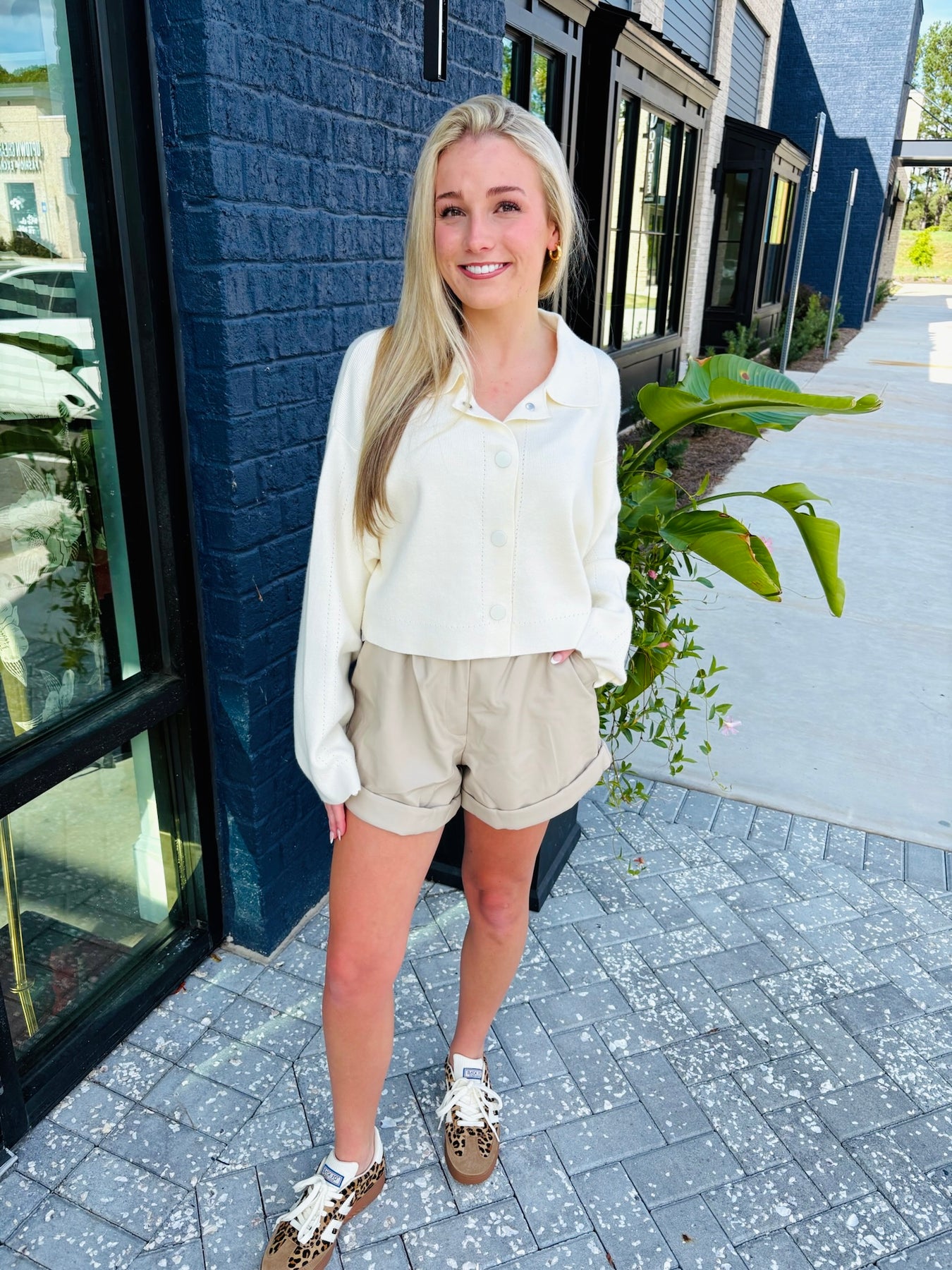 Button-down collared jacket with batwing long sleeves and pointelle trim accents.