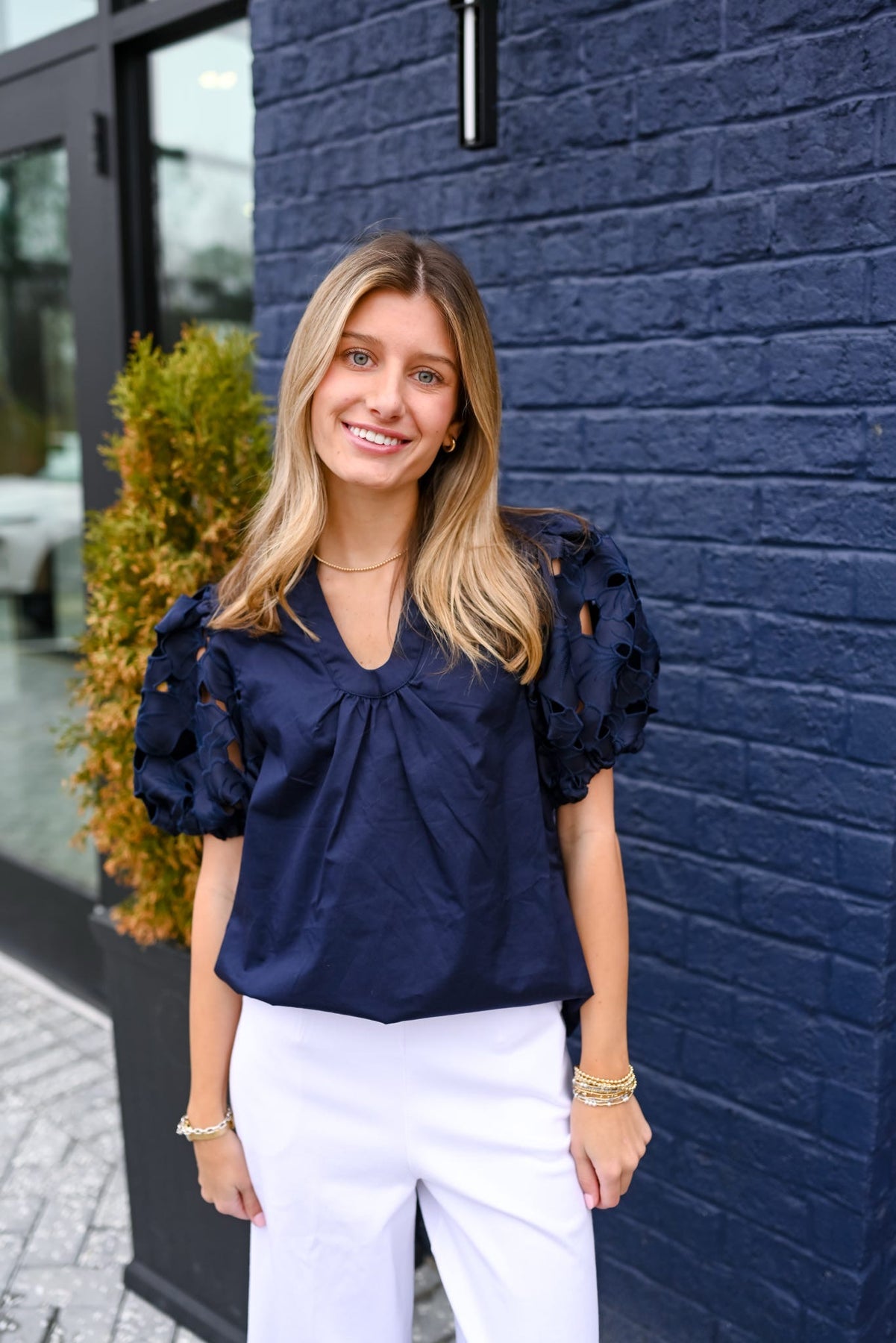 Navy top featuring a v-neckline with short puffy sleeves and eyelet details throughout! So cute when paired with white denim.