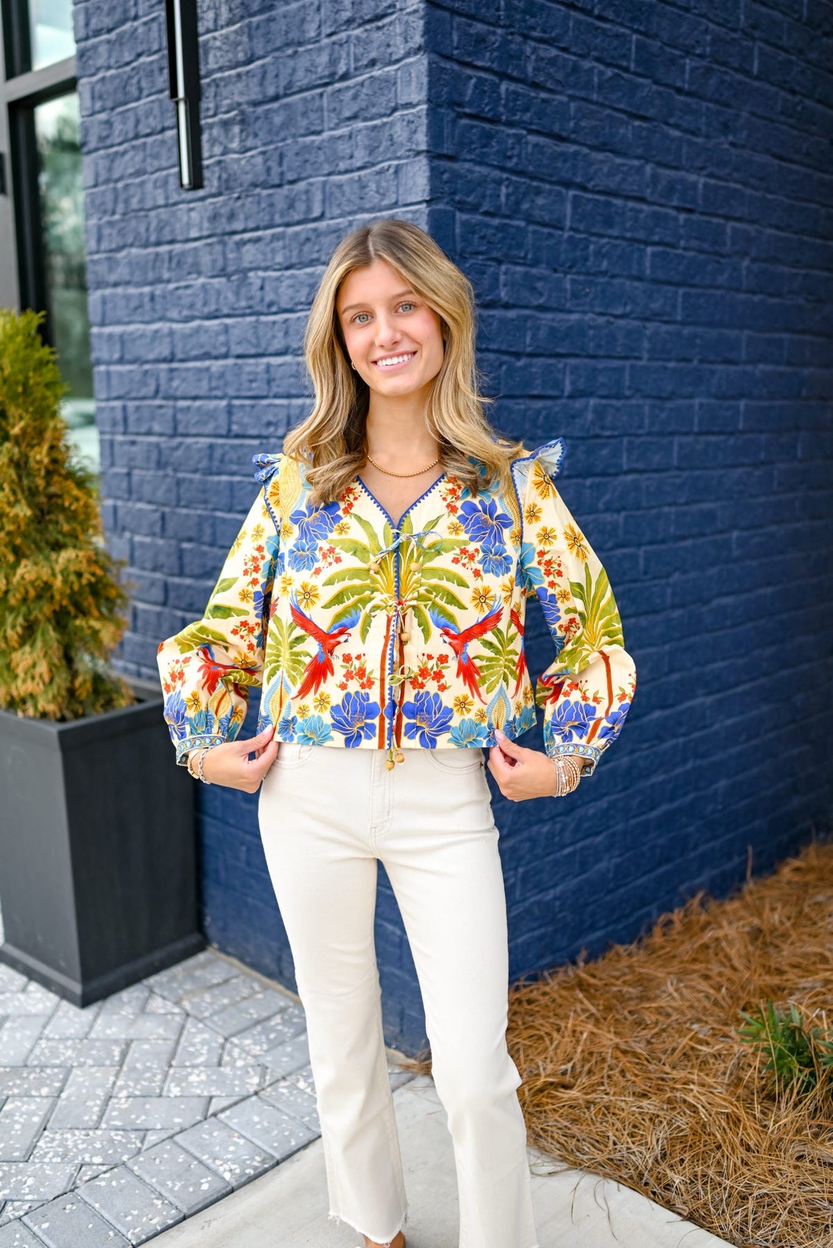 Long sleeve printed top. Pair with the Daze Crop Flare Jeans for this look or pair with the matching Paradise Printed Midi Skirt.