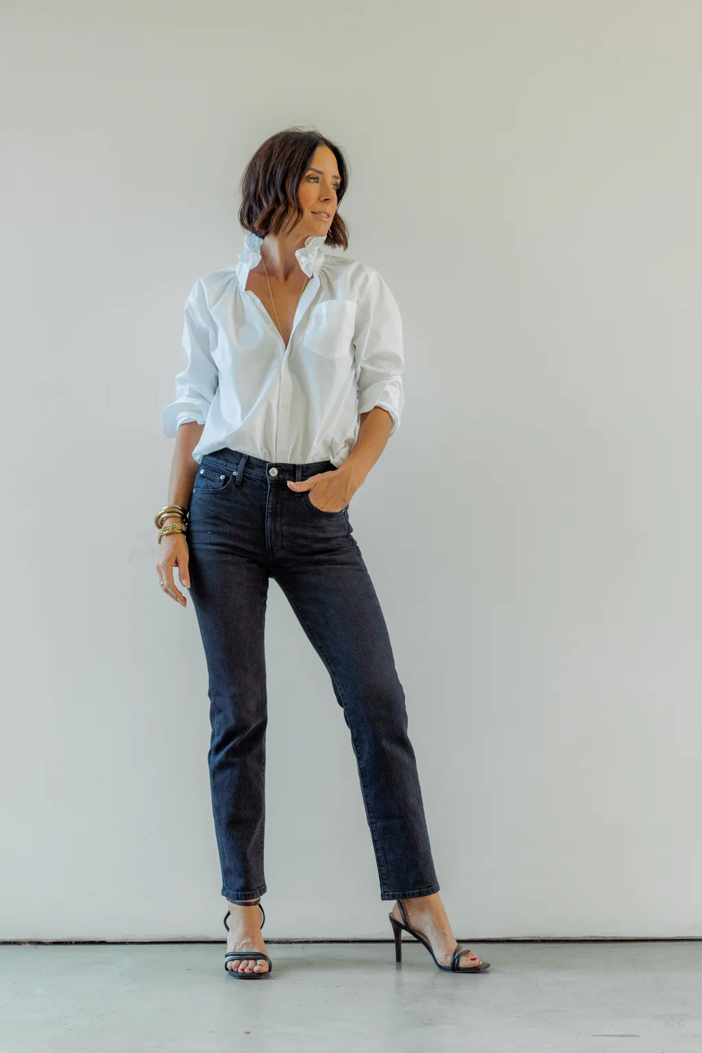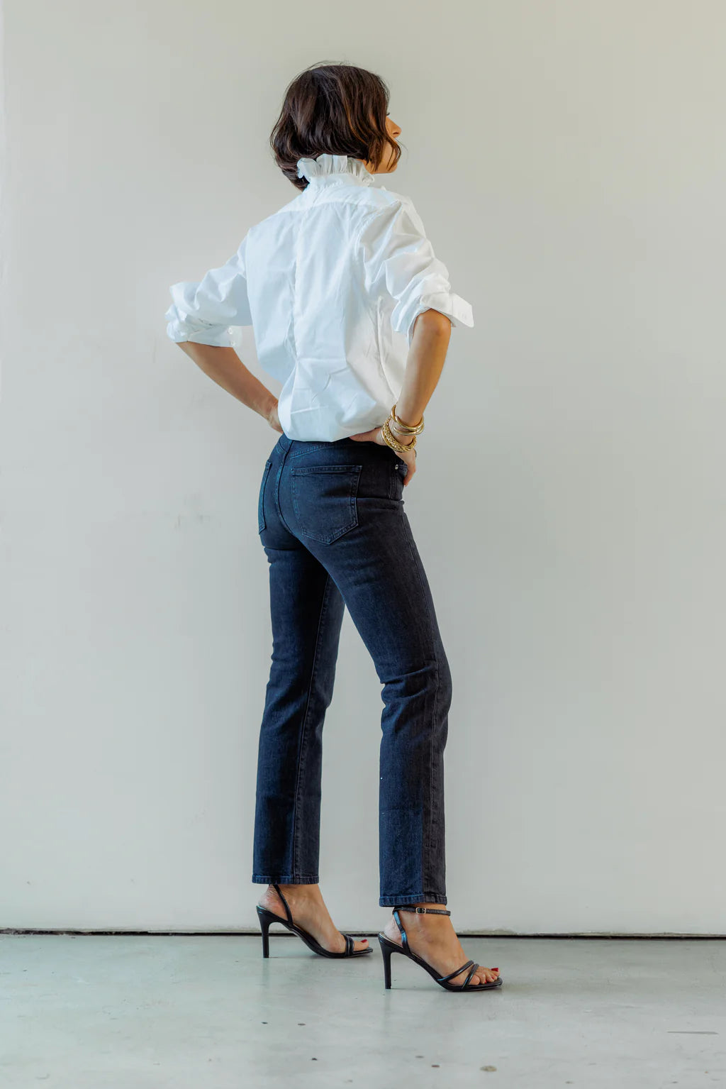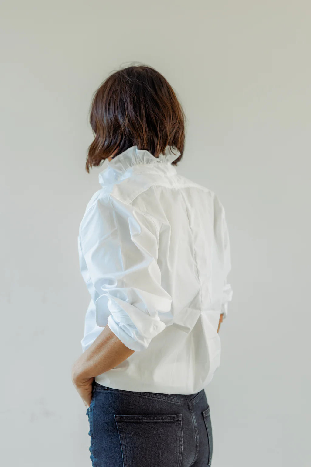 The Quarantina Top offers the comfort of a boyfriend shirt with a touch of feminine flair, courtesy of KMJ's signature ruffle collar. Whether you opt to wear it buttoned down for a relaxed vibe, tied at the bottom for added flair, or tucked in for a polished look, Quarantina gives you the freedom to express your style with ease.