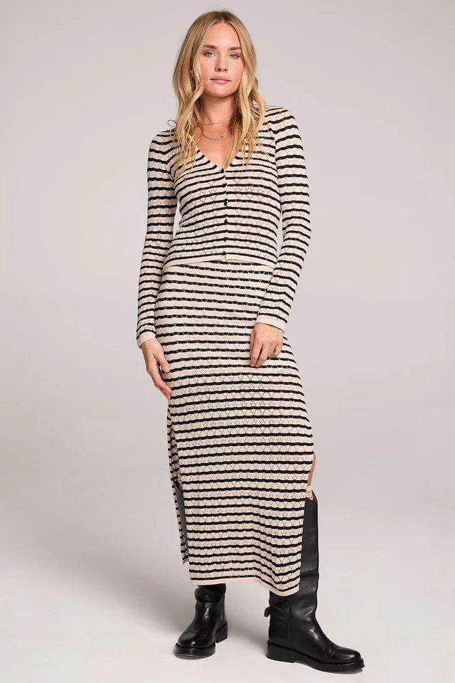 The Suzi Midi Sweater Set features a simple, straight woven silhouette adorned with an elegant black and white striped pattern. The top features a deep V-neck and a delicate petite stripe design, it can be worn buttoned up as a top or open over your favorite tee. The skirt has twin slits on both sides to maximize comfort and style.