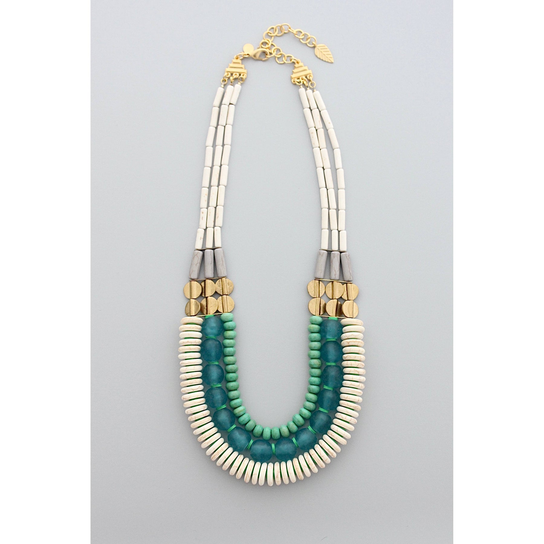 20" triple strand necklace with magnesite, turquoise, vinyl, brass, and Ghana glass. 3 inch extender.