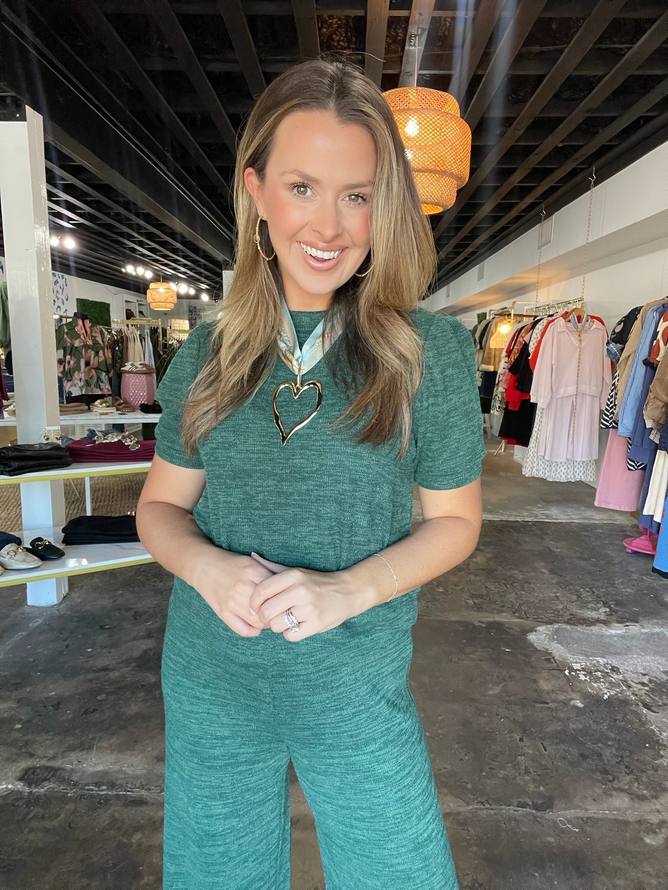A ribbed knit t-shirt style top with short puff sleeves and a round neck. Paired with a matching pair of knit green ribbed pants, a high rise elastic waistband and a straight leg style. Perfect for being cute and comfortable!