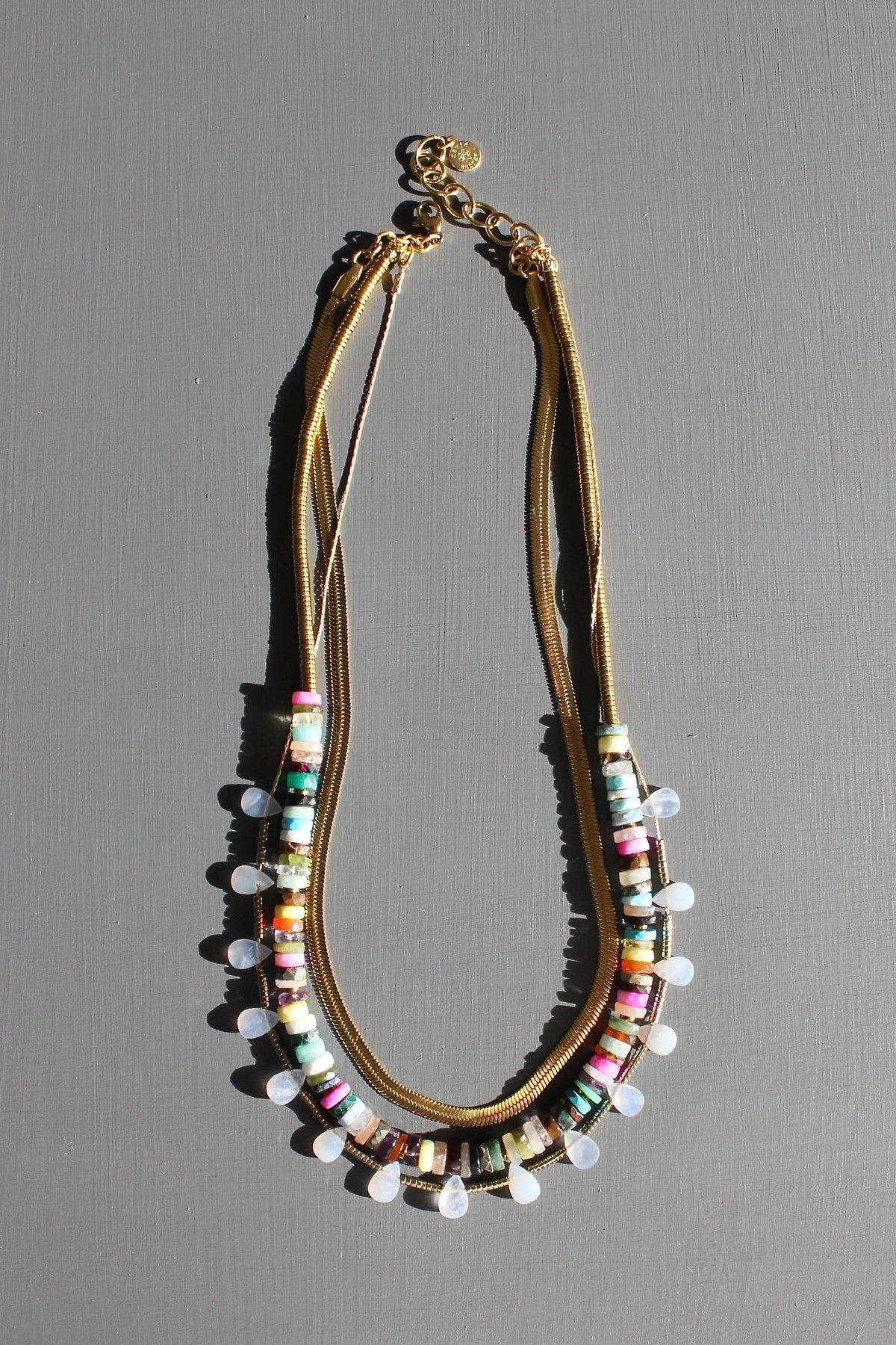 17” triple strand necklace with 18k matte gold plated herringbone and snake chain, stone discs, hematite, and agate teardrops. 2 inch extender.