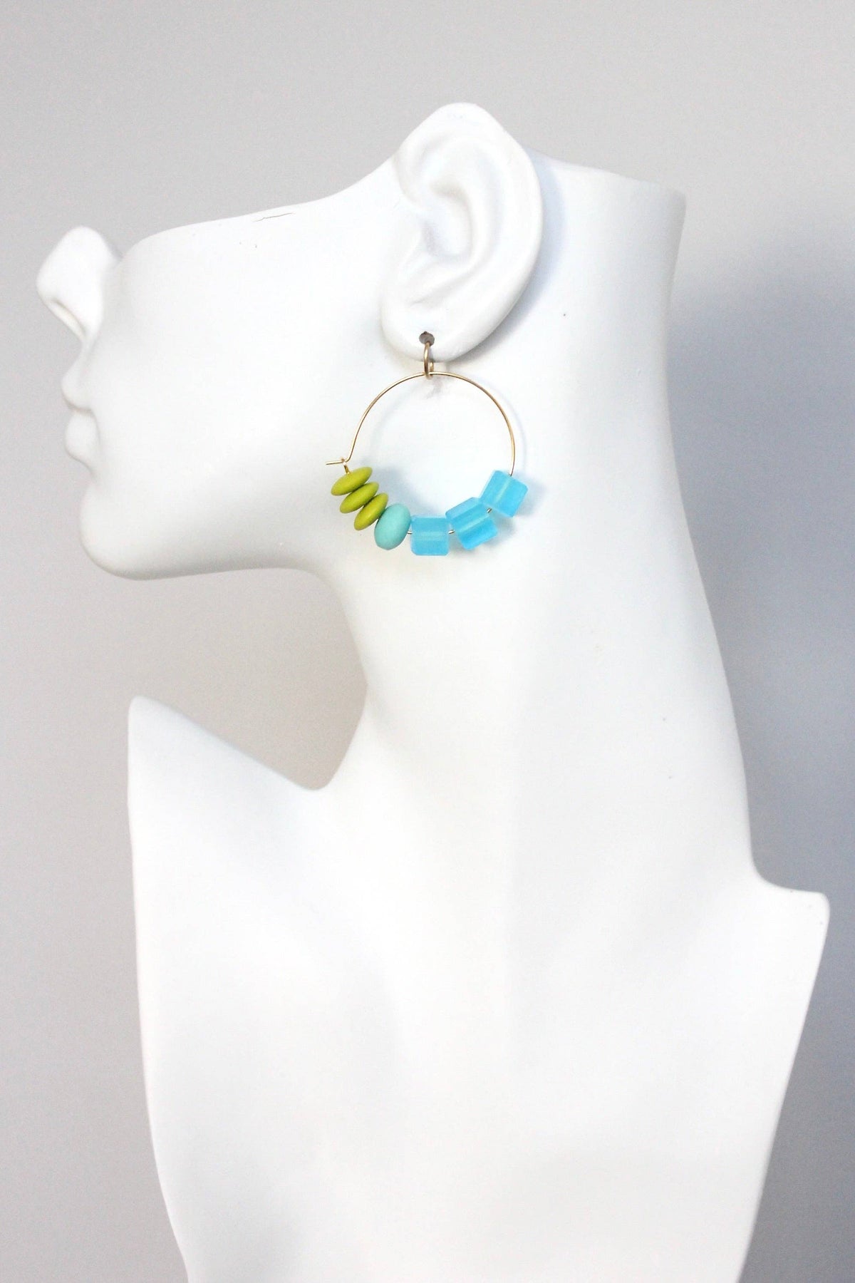 Hoop earrings with turquoise, chartreuse, and aqua glass beads. Each earring weighs .22 oz. and measures 1.5 inches in length from top to bottom.